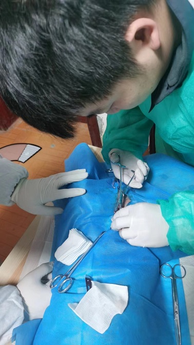 在基地简易手术室学员们从保定、听诊、扎留置针、消毒、术前用药、镇痛麻醉及手术有条不紊,从容操作。三天时间共为流浪犬猫完成手术六十余例。