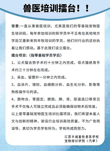 该班课程唯一安排有二个月的实训时间,学员从零基础兽医开始,课程循系渐进,理论教学+大量实操+病例跟诊+案例剖析等无可复制的宠物兽医培训特色,让学员身临其境,真正实现零基础小白蜕变宠物医生特训课程。大部分学员学成后陆续开办了宠物诊所或医院,有的被推荐或高薪应聘在国内各大城市宠物医院。