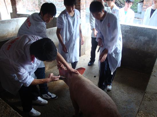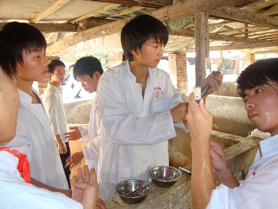 9月9日,我校进行了开学典礼,校长王仪贵就“天道一定会酬勤,彩虹总在风雨后”作了重要的学前讲话,校长的报告为同学们热爱畜牧兽医事业树立了坚定的信心。开学后,学校坚持理论与实践紧密结合的教学方法,在这里学生每周有机会接触大量的猪、禽等动物。图为开学后的9月13日牧医班的新生在养殖场的部分实习情景。