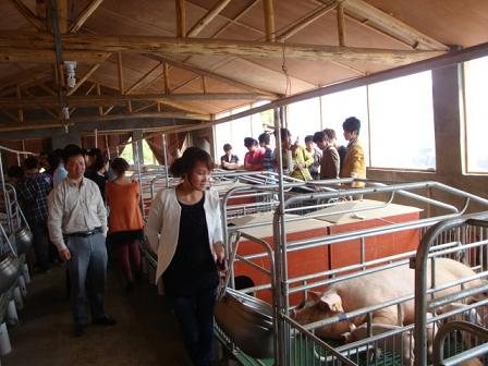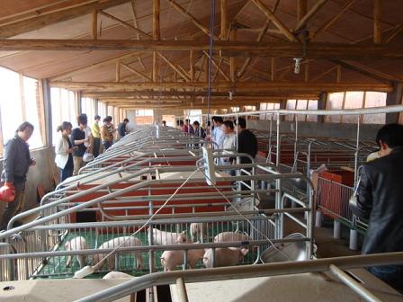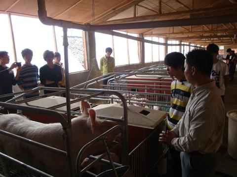 2012年3月26日,风和日丽。畜牧班的同学们在老师的带领下,前往学校的养猪示范基地——红星生态养殖场实习。在现场范老师从拦舍设计、设施、猪品种、防疫、用药、环保和市场诸方面进行了现场教学。之后有的同学感慨:只要来到学校才知道学的重要。图为同学们在先进的养猪车间学习生产工艺技术