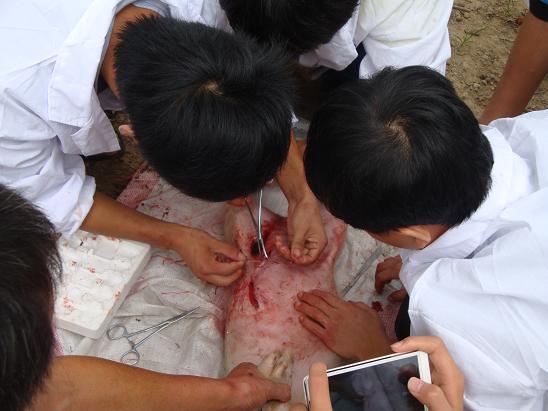 兽医班的学生在作疝气及肠坏死切割缝合手术