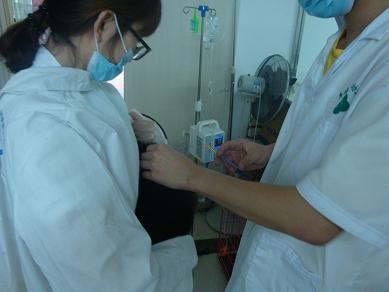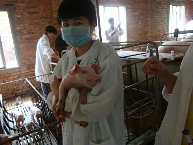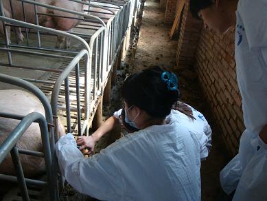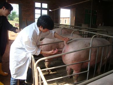 ,我校兽医班学生在见习老师的带领下,在种猪场进行穴位注射实习。(图为学生亲自操作)。