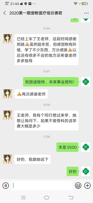 广东学员车先生,一年前就考过了国家执业兽医资格证书,为了学到系统和过硬的宠物医疗技术,通过朋友介绍来到江西丰牧学习。学成后发来微信:为走宠物这条路,看了很多书,听了很多课,但在江西丰牧学习不仅有系统教学且有大量实操机会,医疗技术有质的提高…选择江西,真的来对了!