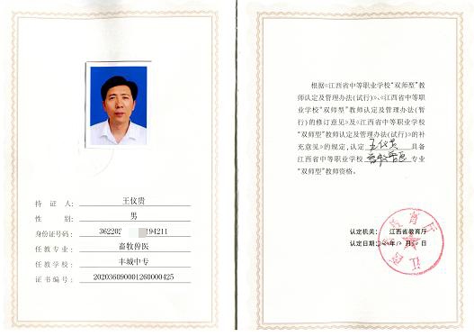 赣教职成字(2020)51号江西省教育厅文件,经主管部门初审,省教育厅复审,考评核定王仪贵、瞿颖具备职业院校畜牧兽医专业“双师型”教师资格。