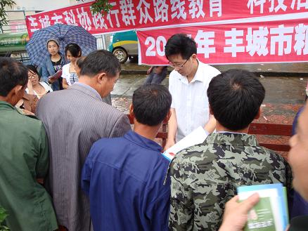 为践行群众路线教育,切实为民办事,2014年5月开始,我校偕同丰城市政农牧部门陆续在全市各乡镇开展“科技周”活动。下图为5月29日上午首站活动在丰城市铁路镇进行。